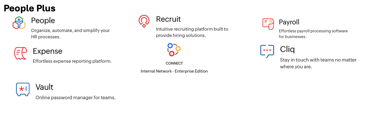 Simplify HR operations with Zoho People Plus—a complete solution that covers employee management, payroll, recruitment, expenses, and internal communication tools like Cliq and Vault. Our team offers personalized support to help you implement the entire suite seamlessly.